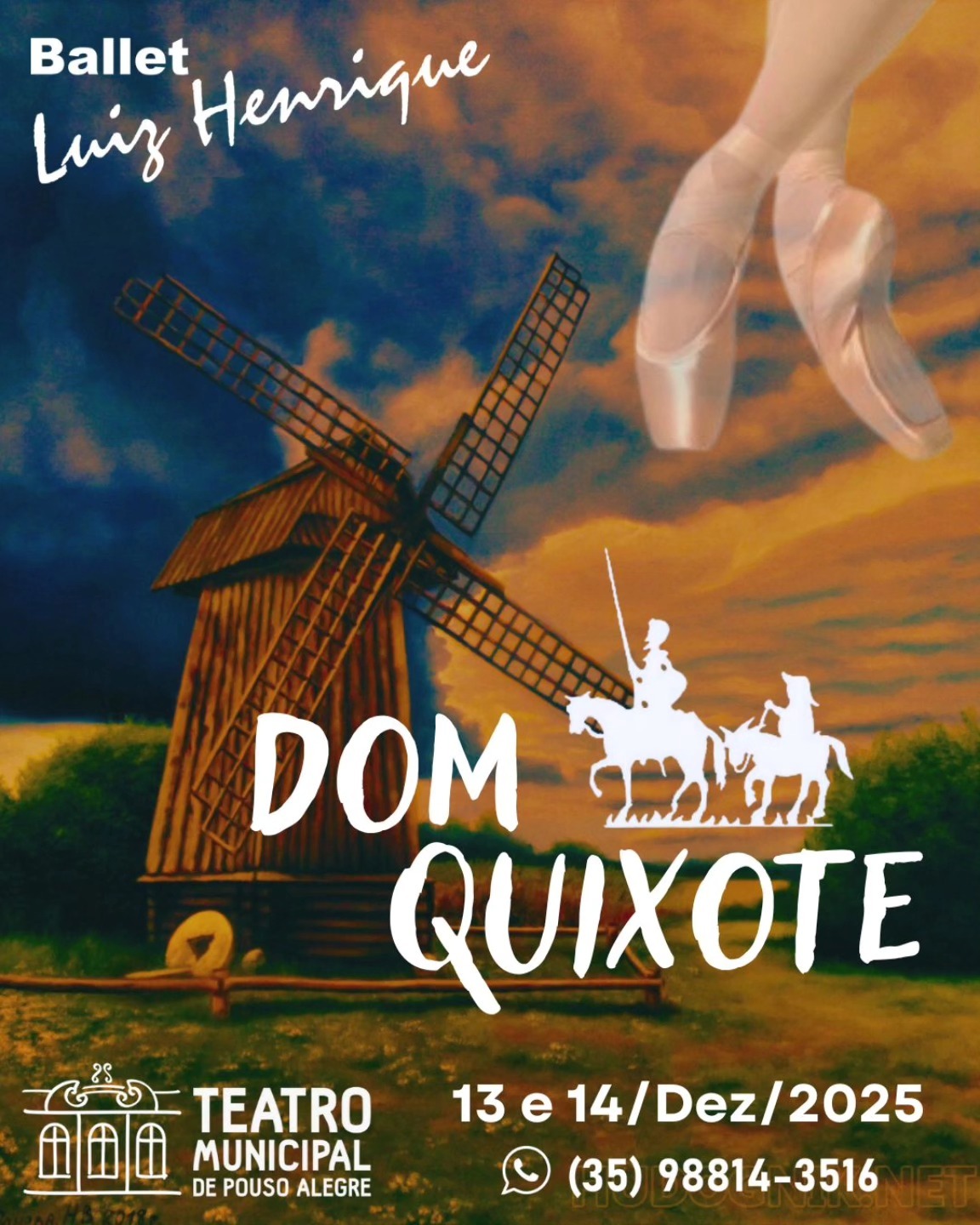 Neste final de semana, o Teatro Municipal recebe duas sessões do espetáculo “Dom Quixote”, apresentado pelo Ballet Luiz Henrique: às 19h, no sábado (13), e às 17h, no domingo (14). Os ingressos estão à venda pelo WhatsApp (35) 98814-3516. A montagem reúne bailarinos de diferentes níveis em uma adaptação cheia de humor, cor e movimento, contando a história de amor entre Basílio e Kitri.