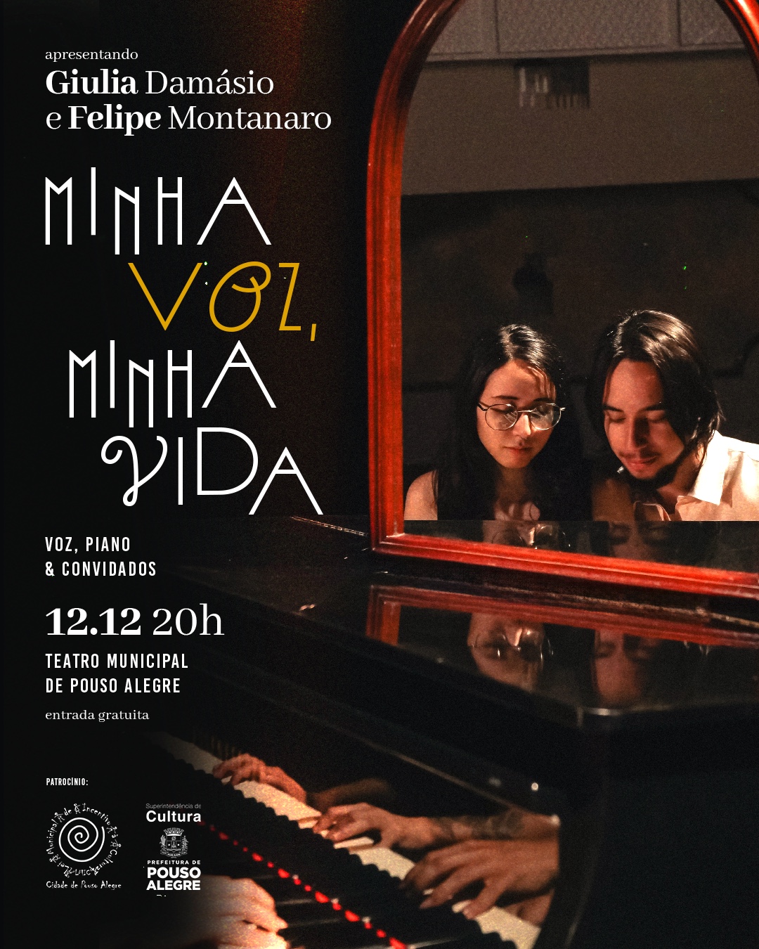 Ainda nesta sexta-feira (12), às 20h, o Teatro Municipal recebe o espetáculo “Minha Voz, Minha Vida”. O show de estreia da cantora pouso-alegrense Giulia Damásio reúne interpretações de clássicos da música brasileira e composições autorais, com arranjos e direção musical de Felipe Montanaro, indicado ao Grammy Latino em 2025. A entrada é gratuita, mediante retirada de ingressos pelo Sympla (https://www.sympla.com.br/evento/minha-voz-minha-vida/3206882). O projeto conta com patrocínio da Prefeitura por meio do Fundo de Projetos Culturais (FPC) da LMIC.