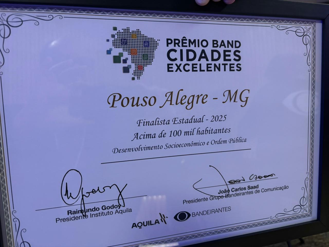 Pouso Alegre segue se destacando em Minas Gerais e no cenário nacional. O município ficou entre as três melhores cidades do Estado, na categoria “Desenvolvimento Socioeconômico e Ordem Pública” do Prêmio Band Cidades Excelentes 2025, promovido pelo Grupo Bandeirantes de Comunicação em parceria com o Instituto Aquila.