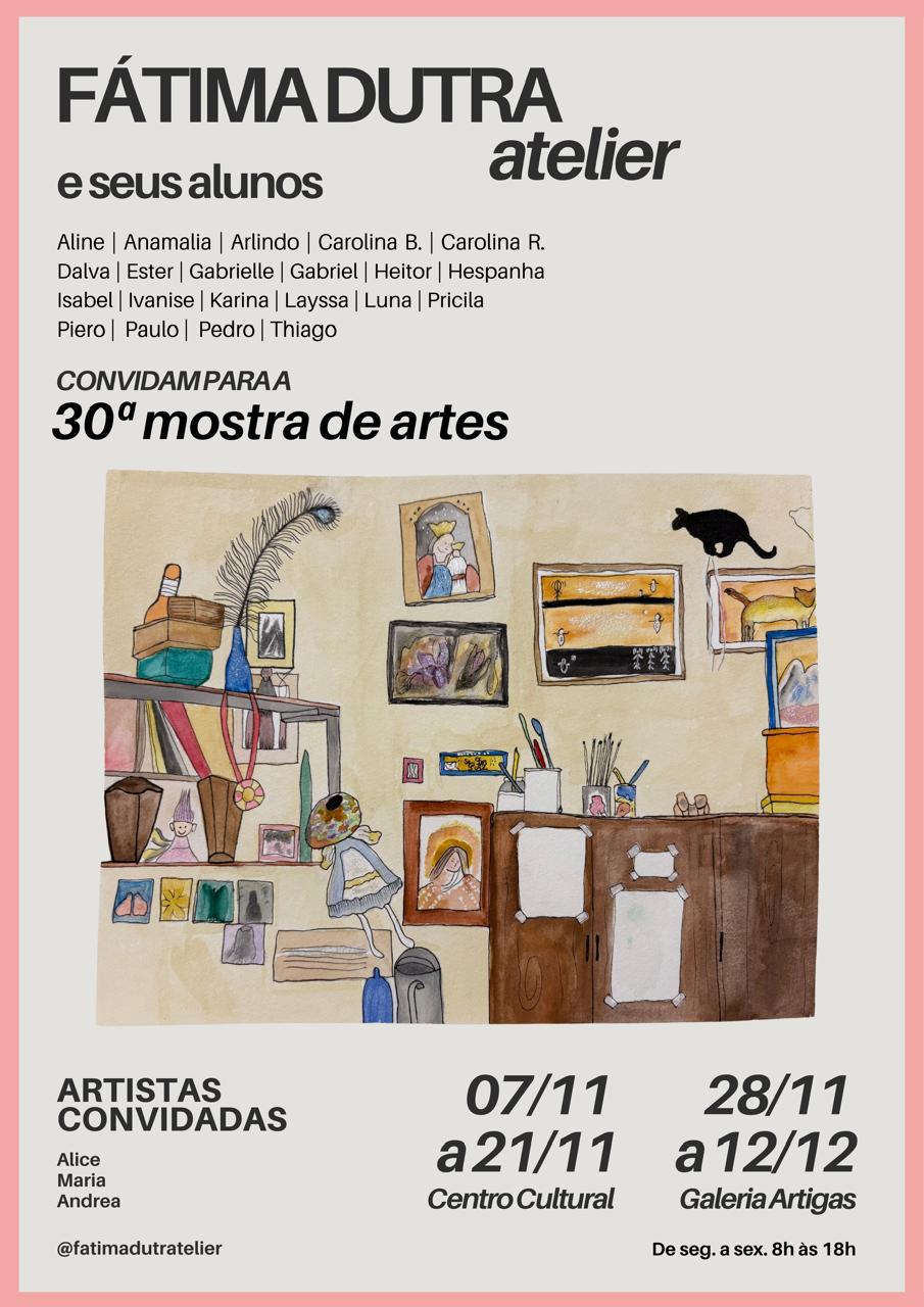 A programação começa com a 30ª Mostra de Artes Fátima Dutra Atelier, na Galeria Artigas, ao lado do Teatro Municipal. A exposição está aberta até sexta-feira (12), das 8h às 18h, com entrada gratuita.